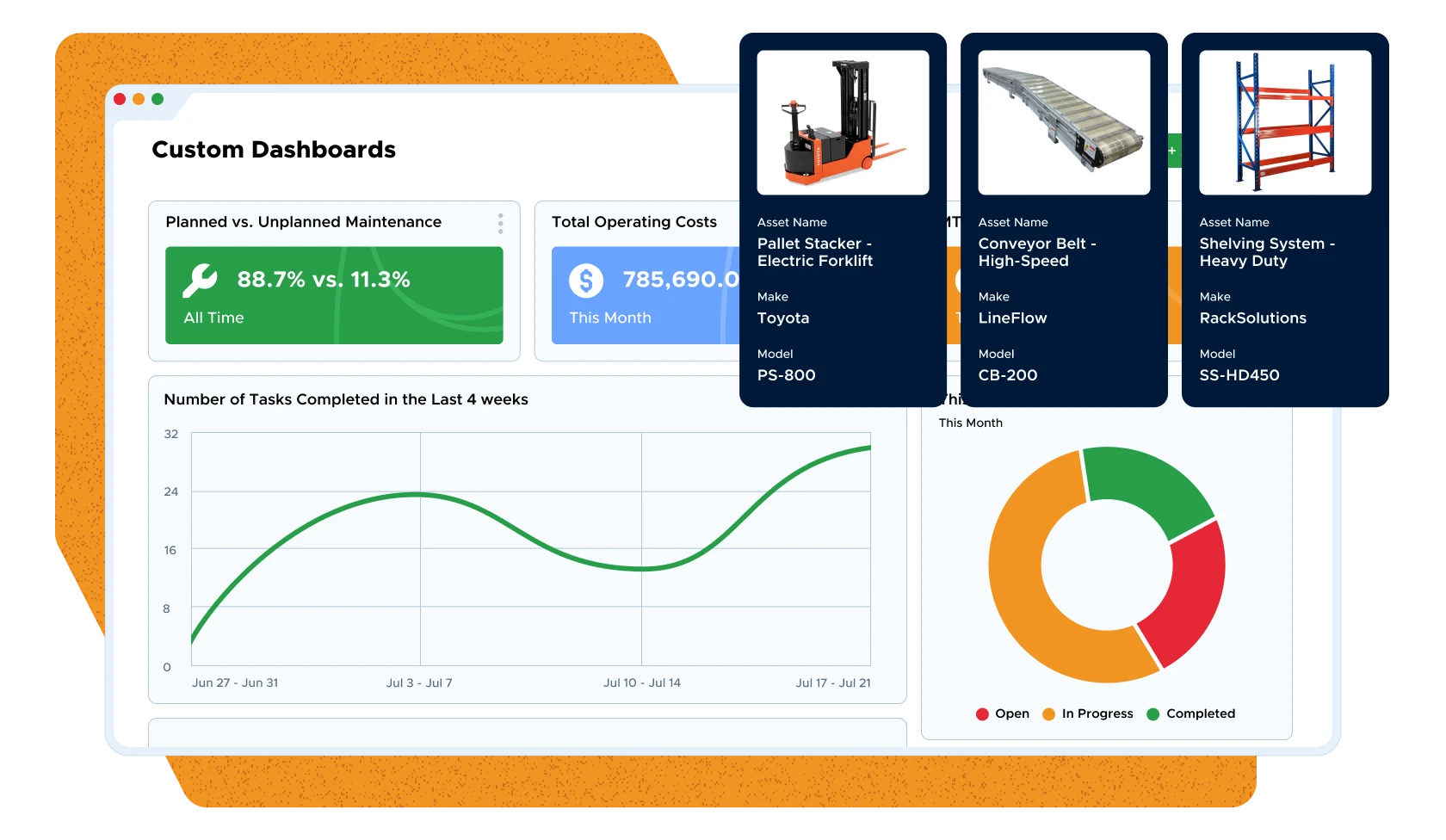 - Monitor downtime trends, asset performance, and maintenance costs.