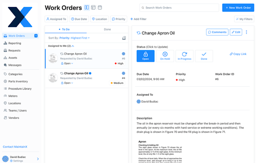 The mobile app works exactly like you’d want it to. Real-time notifications keep everyone updated, work orders sync instantly between devices, and techs can access asset histories, parts inventory, and repair manuals from their phones.