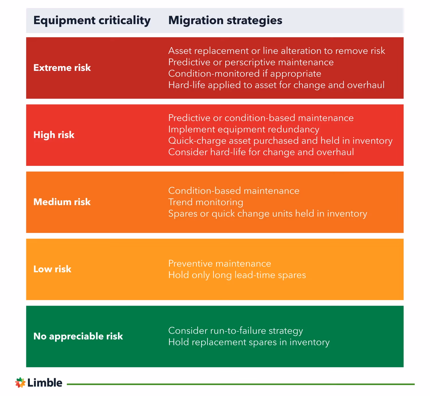 While not prescriptive, the matrix provides an aide-memoire to guide engineers, maintenance planners, and maintenance managers on suitable risk mitigation options while offering other considerations, such as inventory or procurement issues.