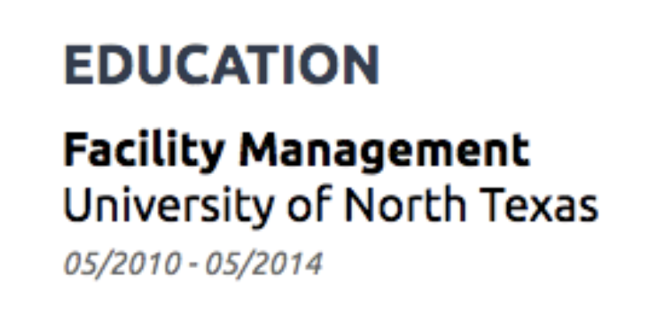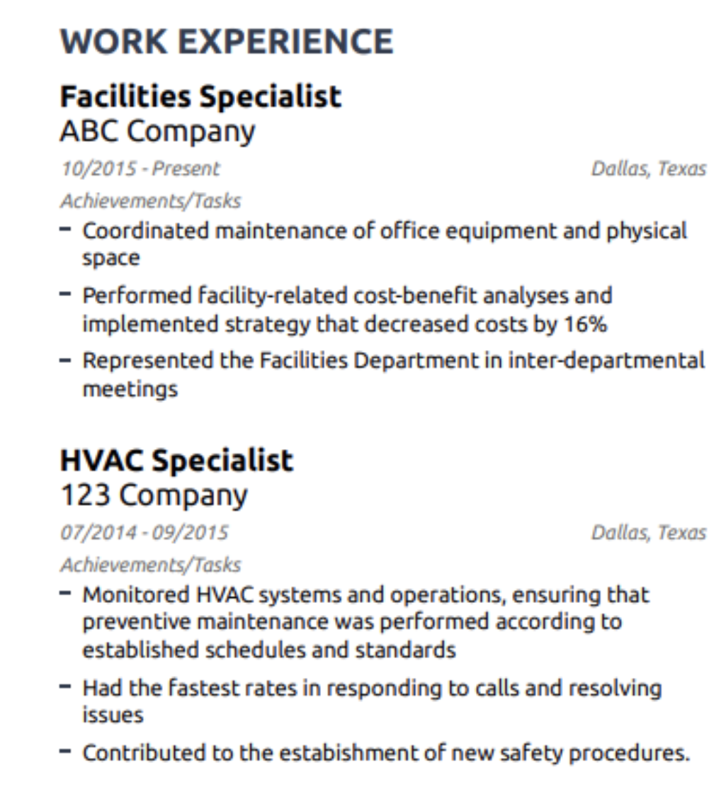 The best way to ace this facility manager resume section is to include concrete results. Saying that you “Implemented a preventive maintenance program” is not the same as saying that you “Implemented a preventive maintenance program that reduced costly corrective maintenance by 45%”.