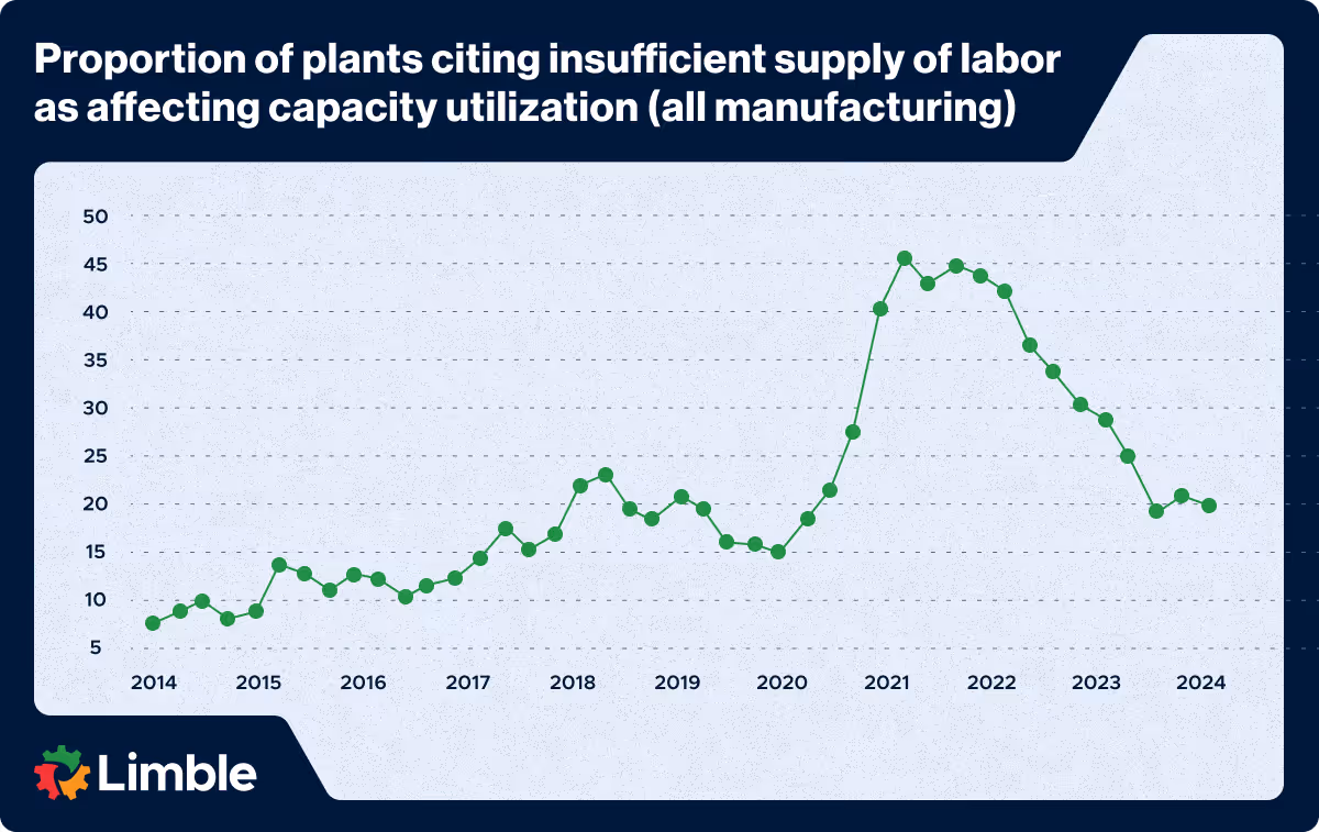 Investing in your workforce doesn’t just improve skills — it boosts morale and reduces turnover. This benefit should not be underestimated. Quarterly Survey of Plant Capacity Utilization (QSPC) data through Q3 2024 says that approximately 20% of U.S. manufacturers were unable to produce at their full capacity due to labor or skill shortage.