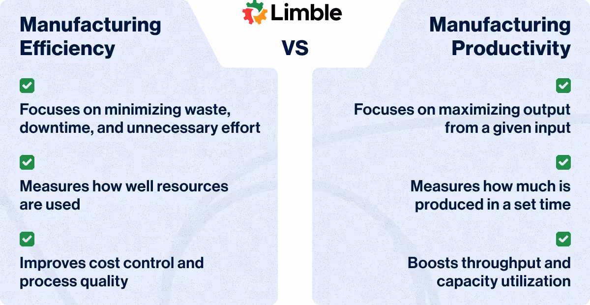 Why does the distinction matter?Well, you can increase productivity by speeding up production — but if that leads to more scrap, machine breakdowns, or worker fatigue — your efficiency suffers and your operational costs increase. On the flip side, improving efficiency often can reduce waste and lower costs — while the output stays the same.