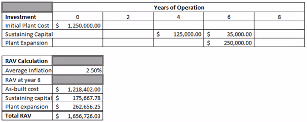 In this example, we’ll assume a plant of 8 years, with moderate capital and expansion investments in the 4th and 6th year.