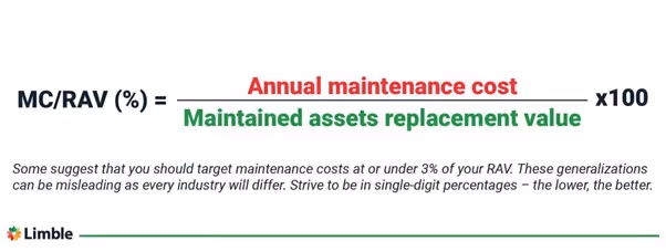 MC/RAV (%) = (Annual maintenance cost / Maintained assets replacement value) x 100