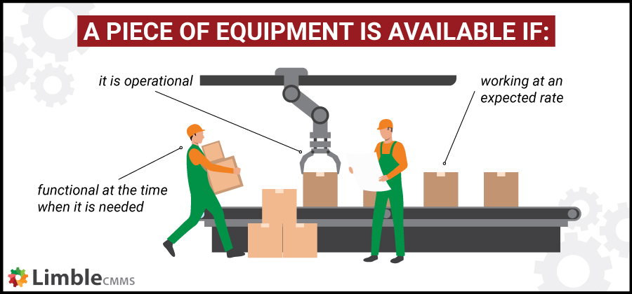 Availability measures the probability of a piece of equipment being available when needed. In other words, it shows what are the chances that a piece of equipment is fully operational during its intended work hours.