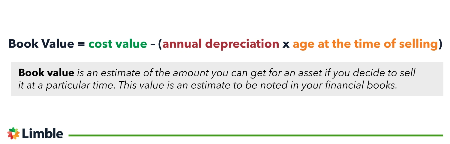 • Book Value: Book value is given by the difference between the cost value of the item and the amount of annual depreciation multiplied by the age of the asset.
